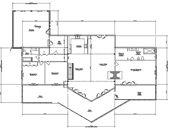 This log home floor plan is designed for those who enjoy light, views, and open space. Its prow front and lots of glass bring the outdoors in, while the open floor plan makes it easy to gather in the main living area. Three bedrooms, with the master suite set apart from the others, offers both privacy and comfort, and a large front deck extends your daily living outside to enjoy the beauty of the outdoors.