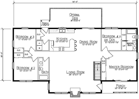 A floor plan that offers comfortable one floor living with a layout that gives everyone their own space. The master suite is set apart on one side of the home, while the opposite wing includes two additional bedrooms and a full bath. A fourth bedroom option make is easy for a growing family, welcome guests, or use it as a hobby/office space.