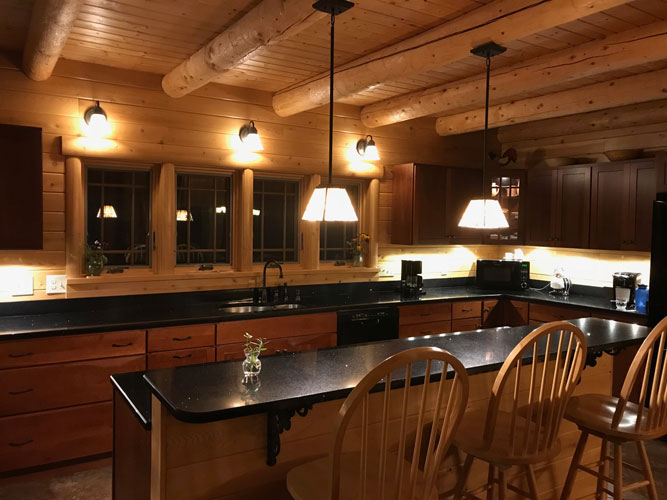 The Madison log home offers mostly one-floor living with an open living, dining, and great room that makes it easy to gather and entertain. The kitchen sits at the heart of the home and features round ceiling joists that add warmth and character. A main floor bedroom and loft space give you flexible options for additional bedrooms, office space, or a quiet place to relax and read a book.